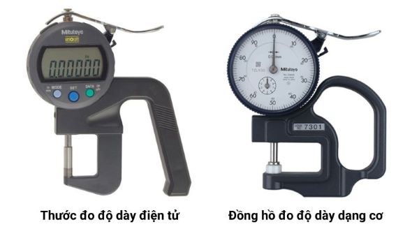 Người ta thường chia thước đo độ dày thành 2 loại là cơ khí và điện tử. Mỗi loại sẽ có đặc điểm, khả năng đo cũng như ưu và nhược điểm khác nhau, cụ thể: