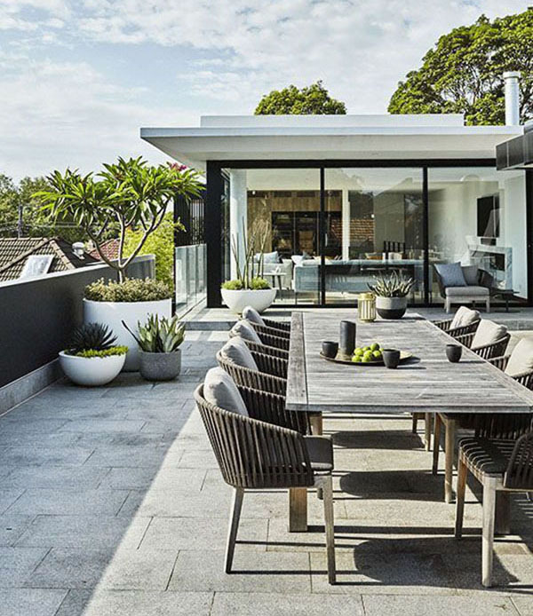 Đồ nội thất nên phù hợp với phong cách thiết kế sân vườn sân thượng đẹp để mọi thứ trở nên hài hòa, dễ chịu. Ưu tiên sử dụng đồ nội thất chất liệu gỗ vì những sản phẩm này rất dễ di chuyển và vệ sinh. Ngoài ra chất liệu đá, kim loại cũng rất được ưa chuộng để dùng trên sân thượng. Chúng có khả năng chịu nhiệt, chịu ẩm tuyệt vời.